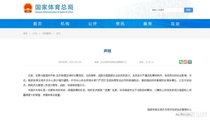 《人民网》这样写道:“日前,在第34届国际乒联-亚乒联盟亚洲杯比赛现场,出现侮辱、诋毁中国国家队运动员的言行。对此,国家体育总局乒羽中心发声强烈谴责,